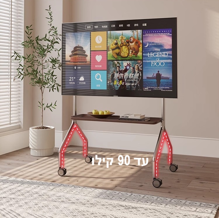 המעמד כולל גלגלים איכותיים לתנועה חלקה בחדר או במשרד. ניתן לנעול את הגלגלים בקלות ולמנוע תזוזות לא רצויות. כך ניתן להזיז את הטלוויזיה בין חדרים ולשנות את זווית הצפייה בהתאם לצורך.
