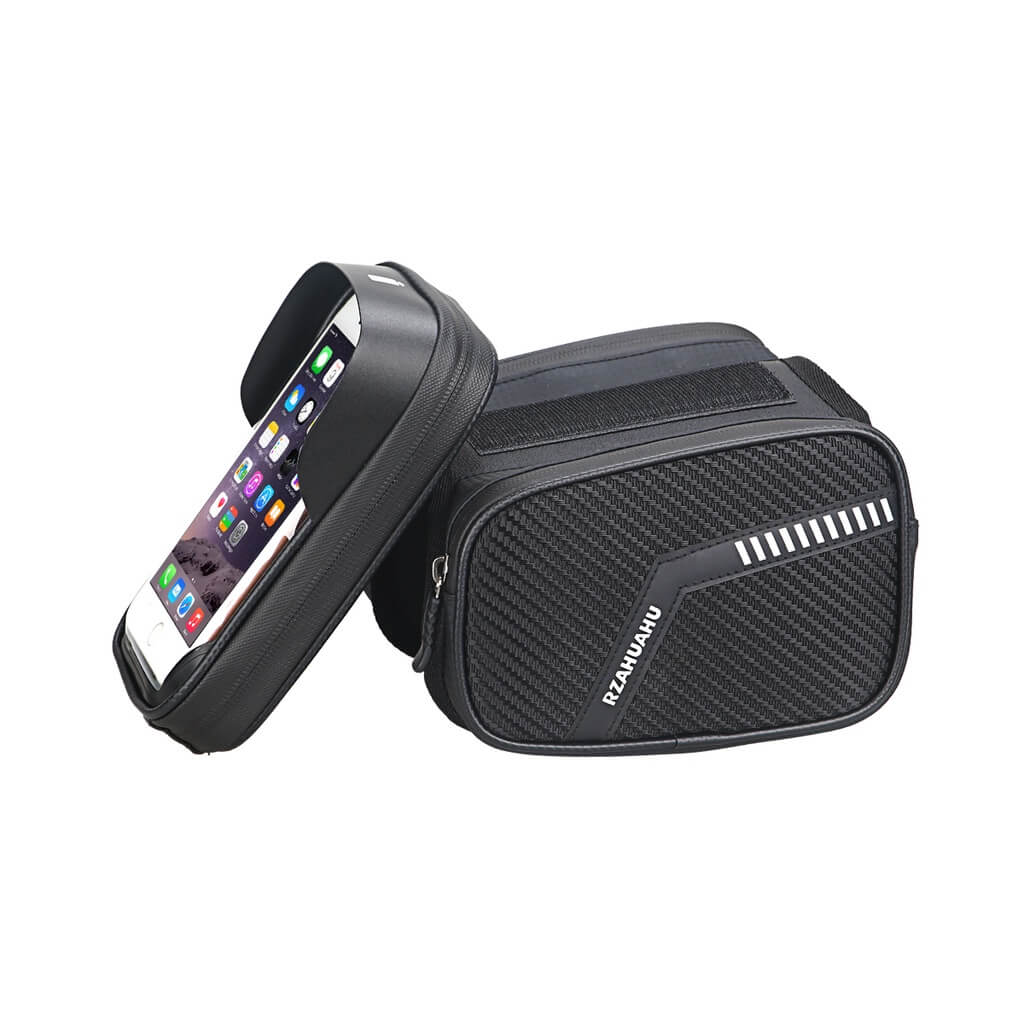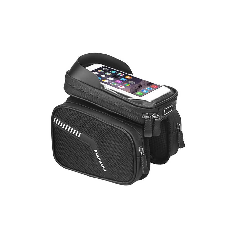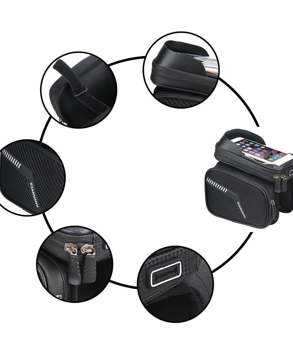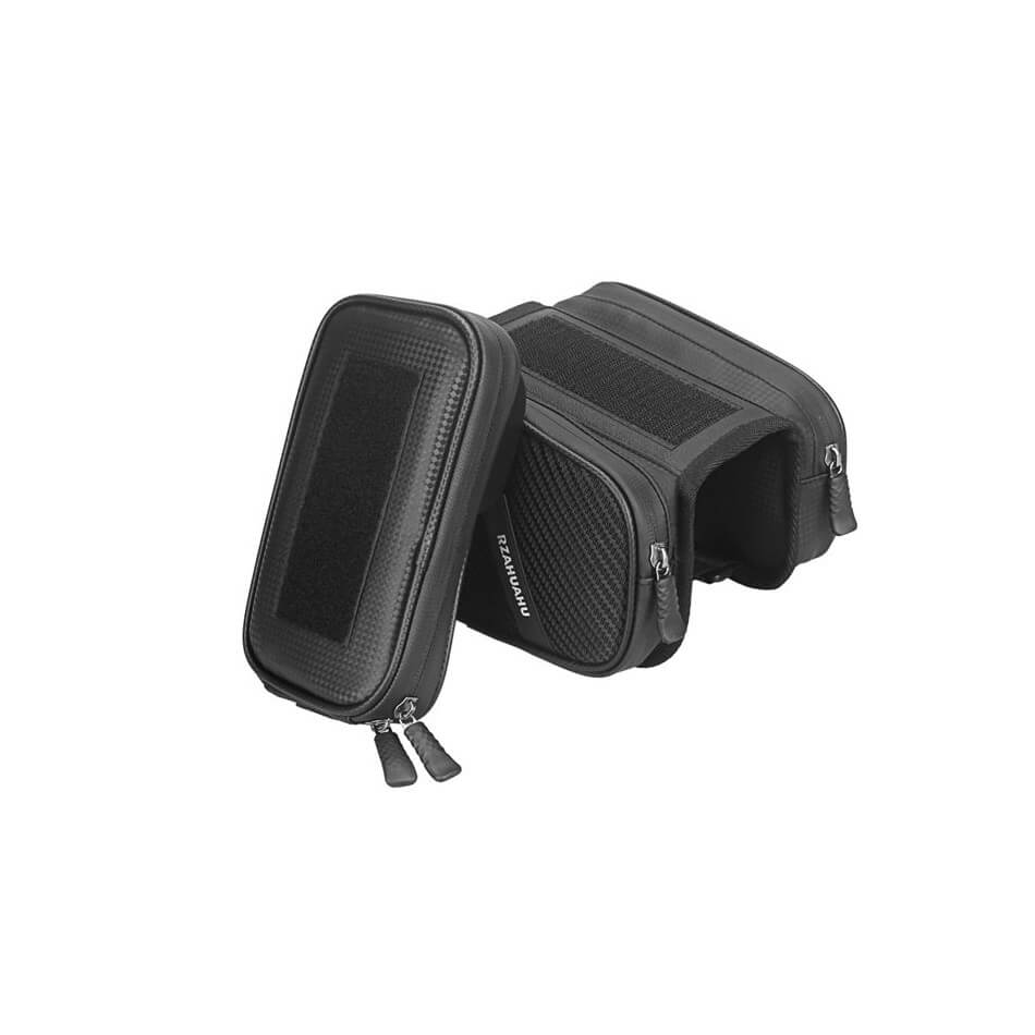 תיק הכולל מעמד לסלולרי לאופניים, זוג תיקים שיושבים על שלדת האופניים, וכולל נרתיק לסמארטפון, הנרתיק הינו חסין מים בנוסף לרוכסנים שמוגנים גם, את הנרתיק ניתן לנתק מהתיקים, זוג תיקי צד מוגנים מים ויושבים בצורה מושלמת על השלדה.