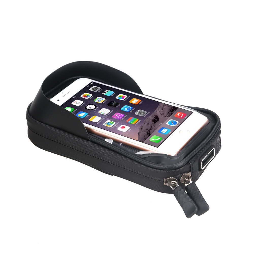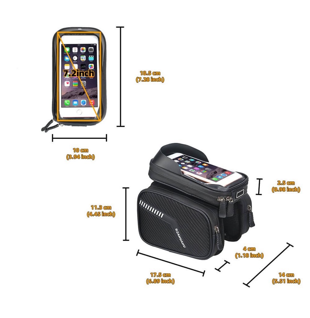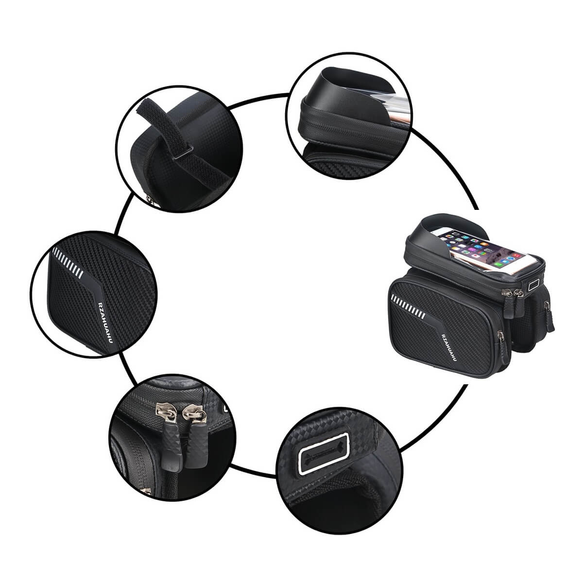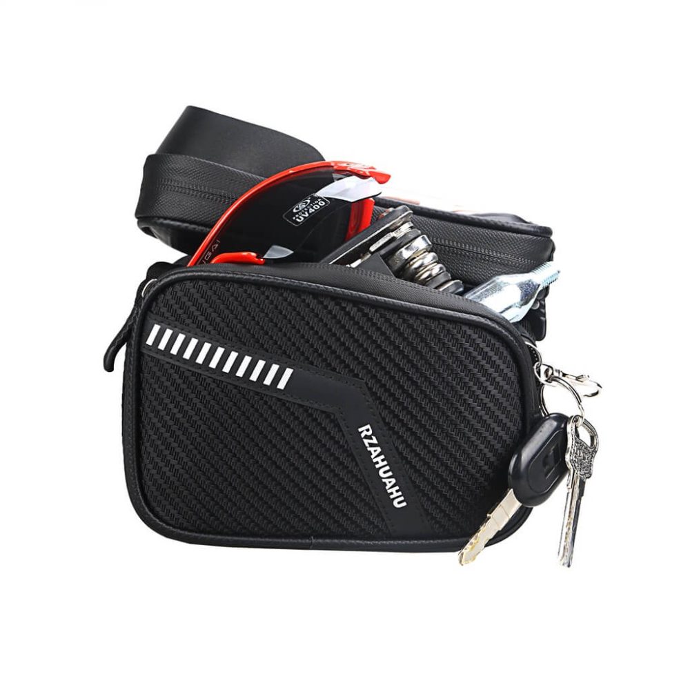 תיק הכולל מעמד לסלולרי לאופניים, זוג תיקים שיושבים על שלדת האופניים, וכולל נרתיק לסמארטפון, הנרתיק הינו חסין מים בנוסף לרוכסנים שמוגנים גם, את הנרתיק ניתן לנתק מהתיקים, זוג תיקי צד מוגנים מים ויושבים בצורה מושלמת על השלדה.