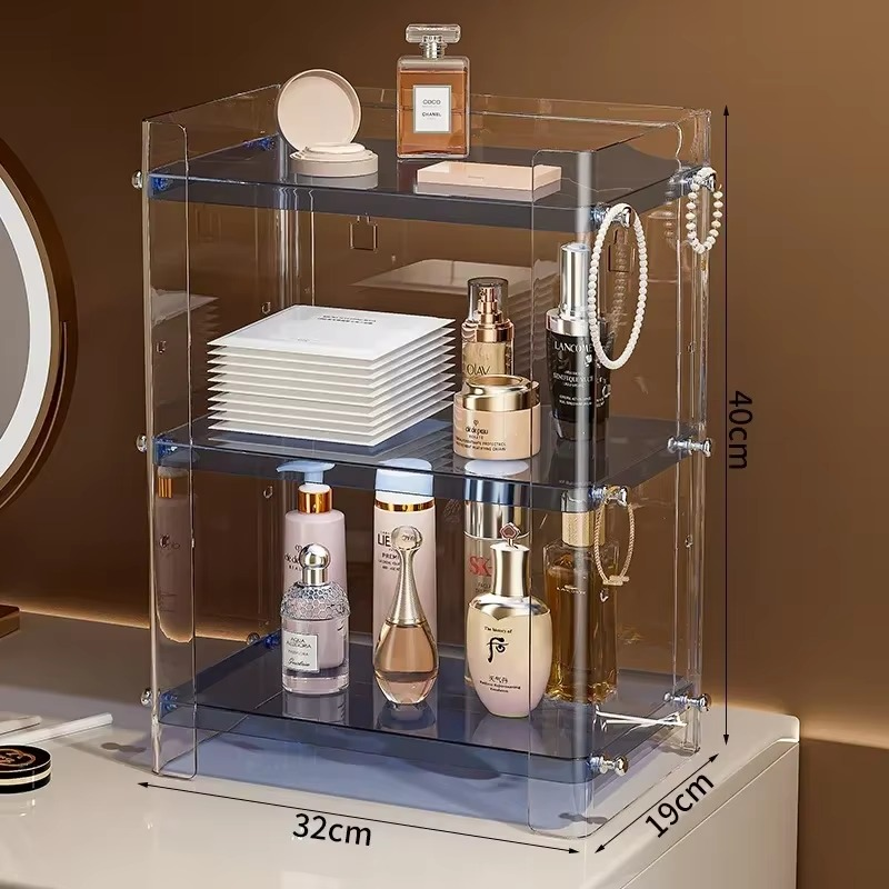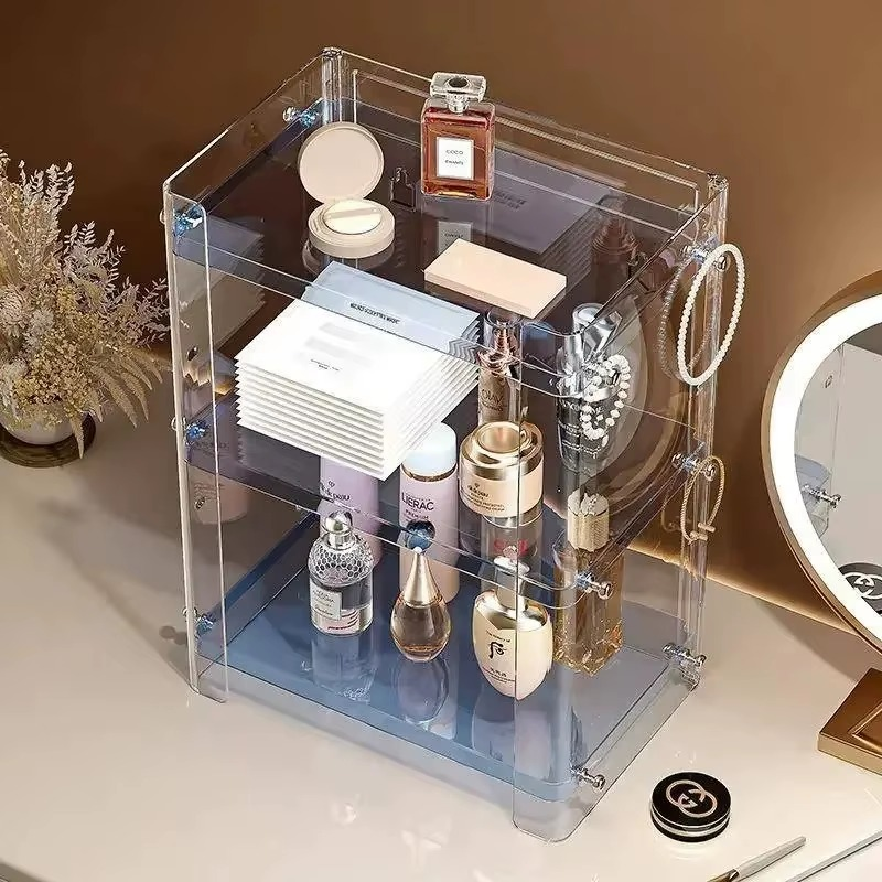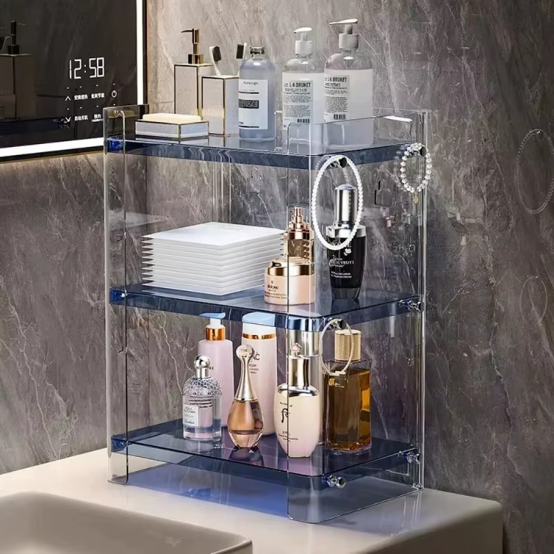 ארונית אקרילית שקופה 3 קומות עם מדפים כחולים – פתרון אחסון ותצוגה מעוצב!