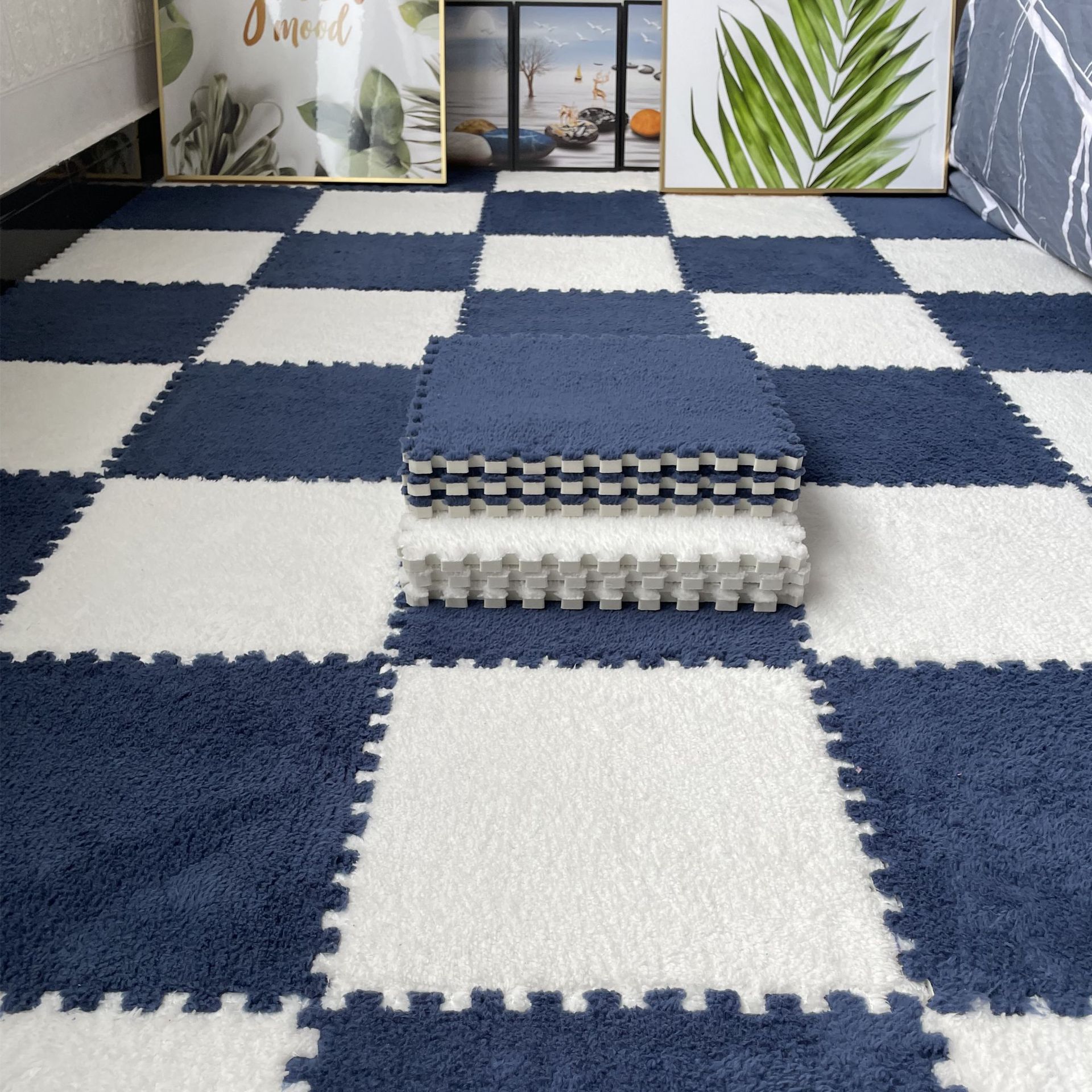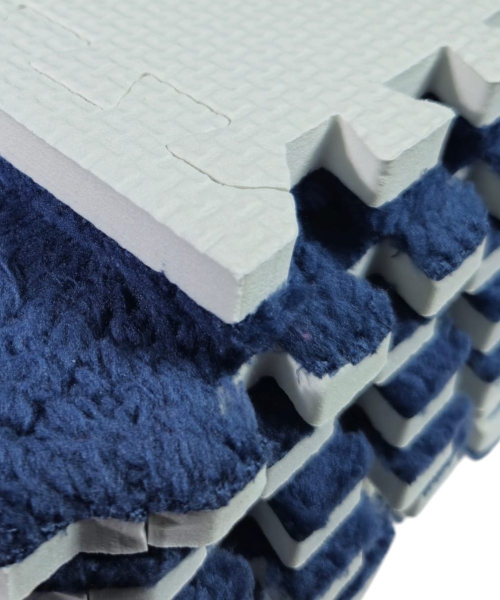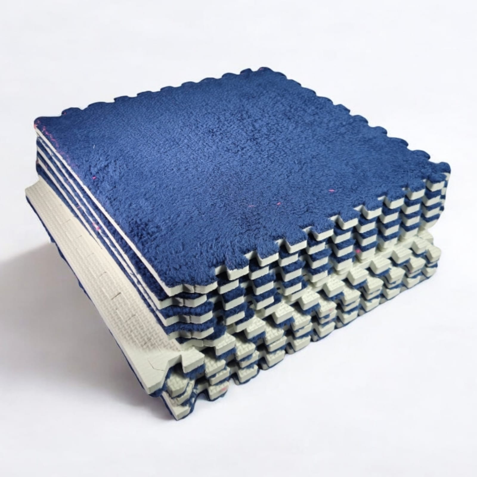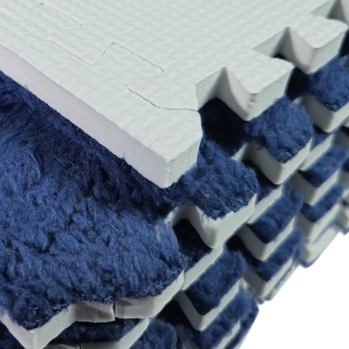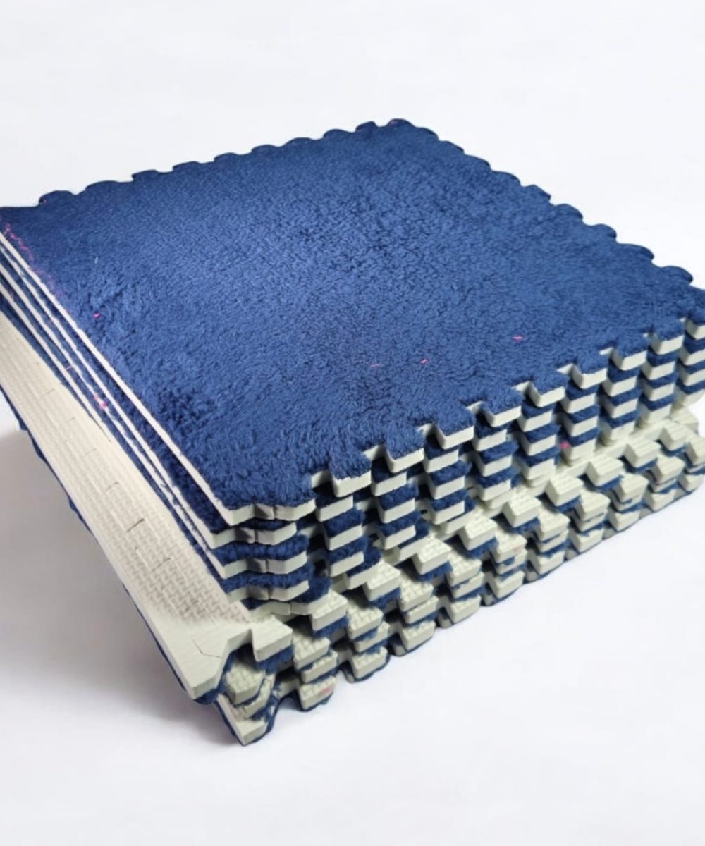 סט 10 אריחים מודולריים עשויים ספוג EVA איכותי ומצופים בפליז אלמוגים רך ונעים למגע. כל אריח בעובי 1 ס"מ ובגודל 30×30 ס"מ, ומגיע בצבע כחול נייבי.