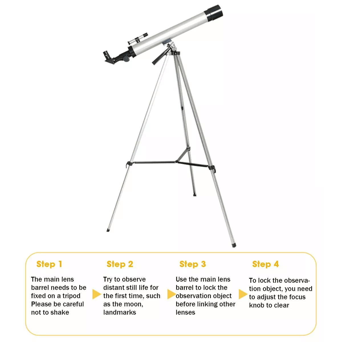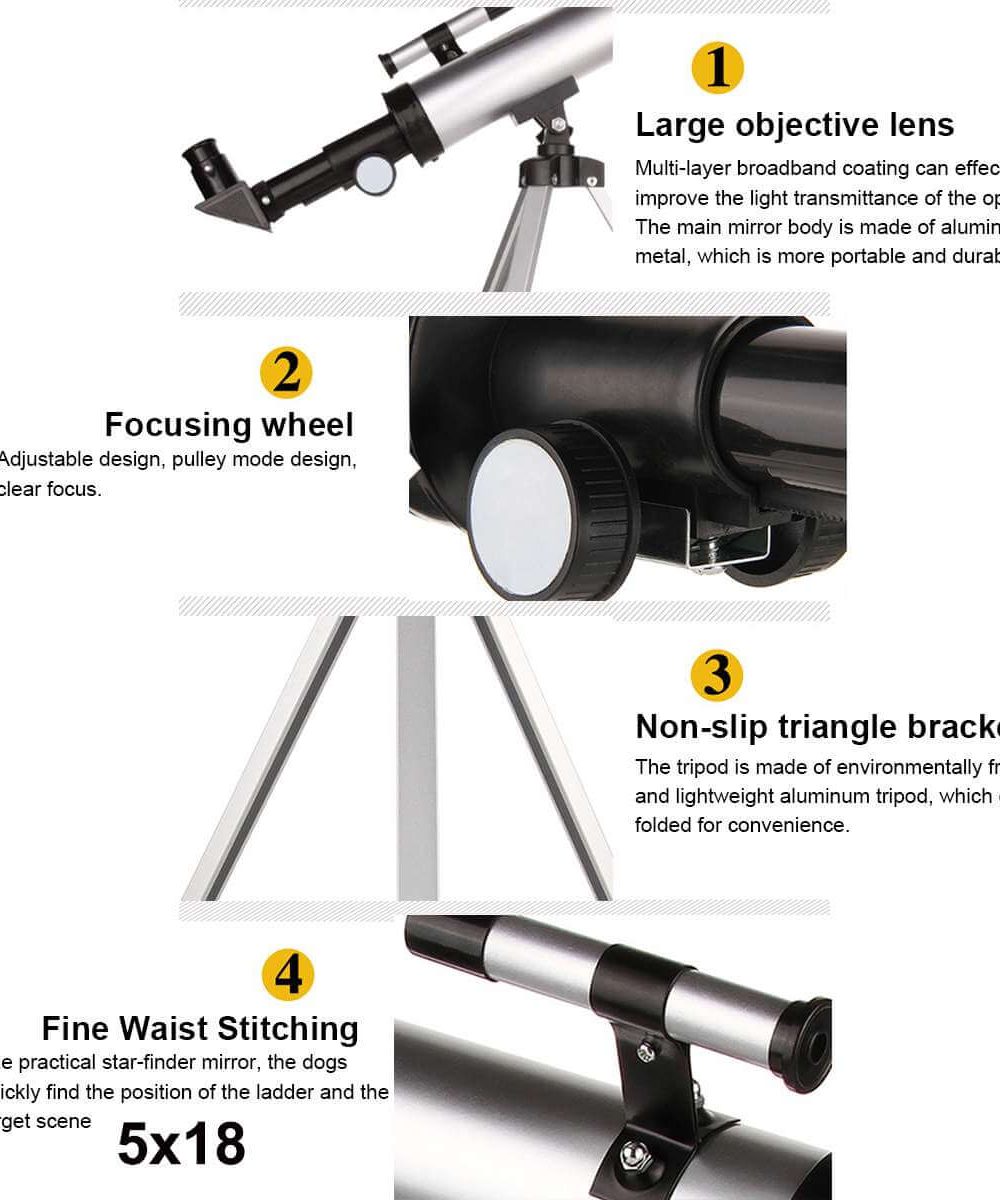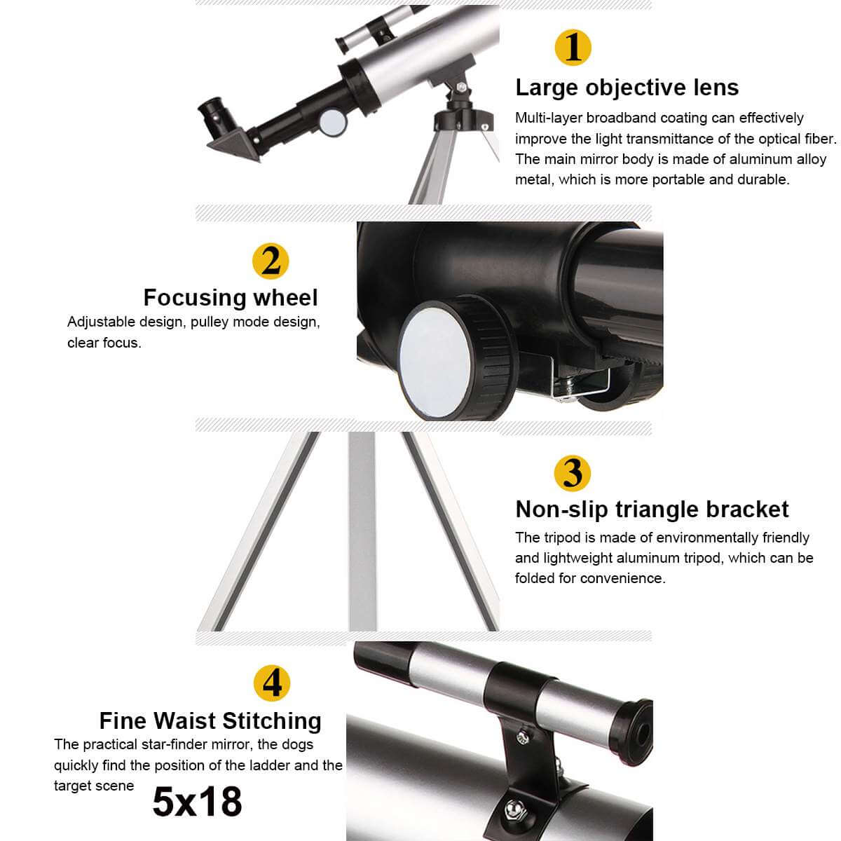 טלסקופ מתחילים לילדים -100X,המתנה המשולמת לילד הסקרן, הילד שאוהב לחקור ולבדוק, טלסקופ קומפקטי ורב-תכליתי, הוא מתאים לתצפיות אסטרונומיות או תצפית על הקרקע, זכוכית אופטית 50 מ"מ וציפוי מלא, כך שגם בתנאי תאורה נמוכים יש גם תמונה ברורה, מתאים לילדים ובני נוער, פרטים טכניים באנגלית