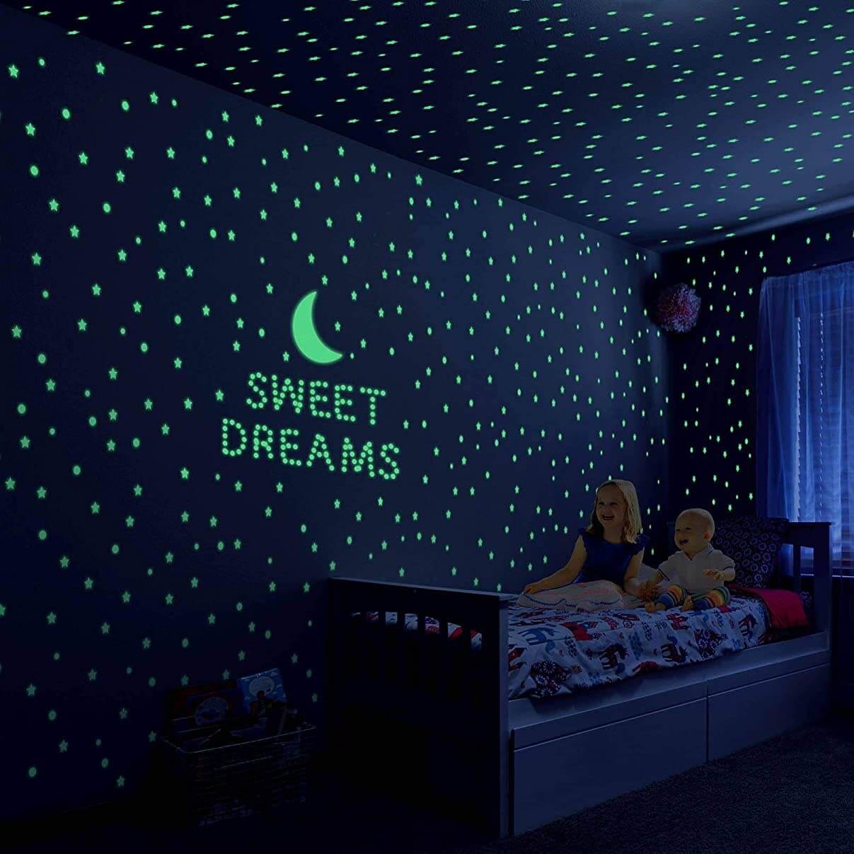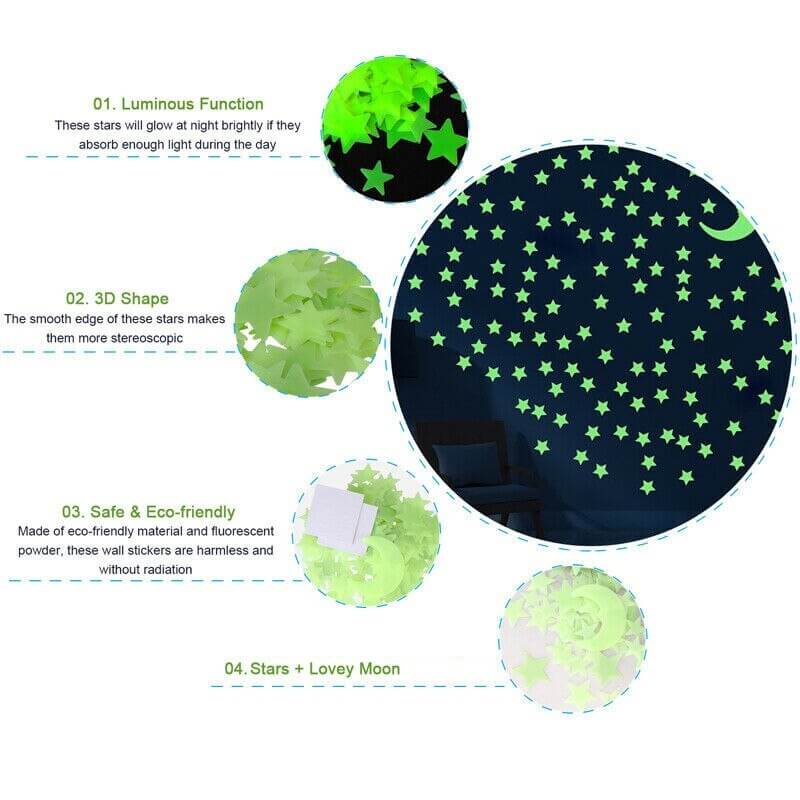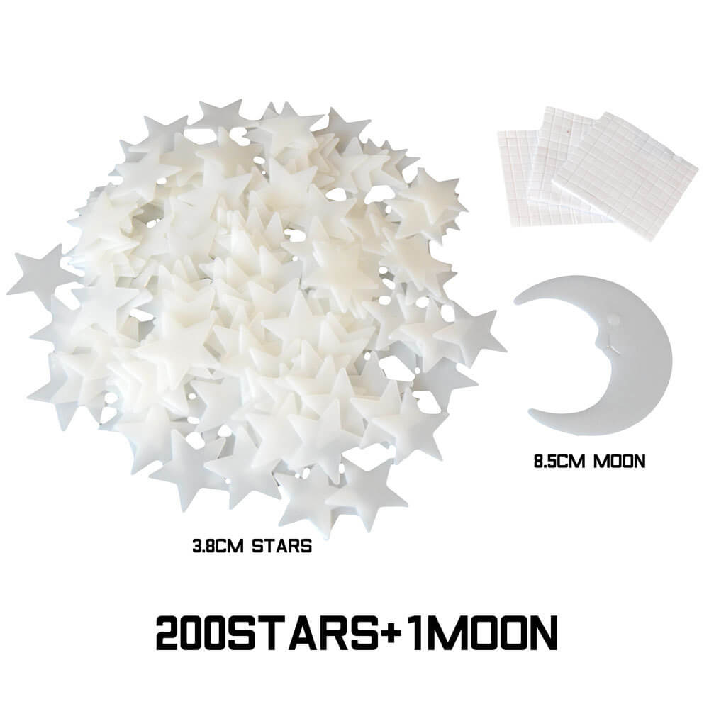 כוכבים וירח זוהרים בחושך, הסט שידליק לכם את החדר, 200 מדבקות פלסטיק בצורת כוכבים, זוהר בכושך ויותר אוירה מקסימה, הסט גם כולל ירח זוהר,קל להדבקה לקיר ולא פוגע בו, אז איך זה פועל?, הכוכבים סופגים את אנרגית האור המנורה בחדר, ואז שהאור כבה הכוכבים נדלקים.