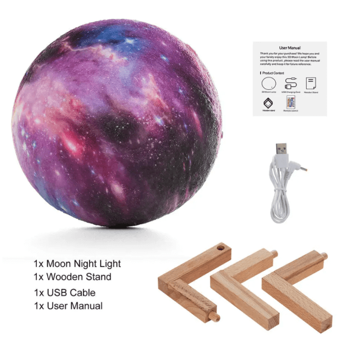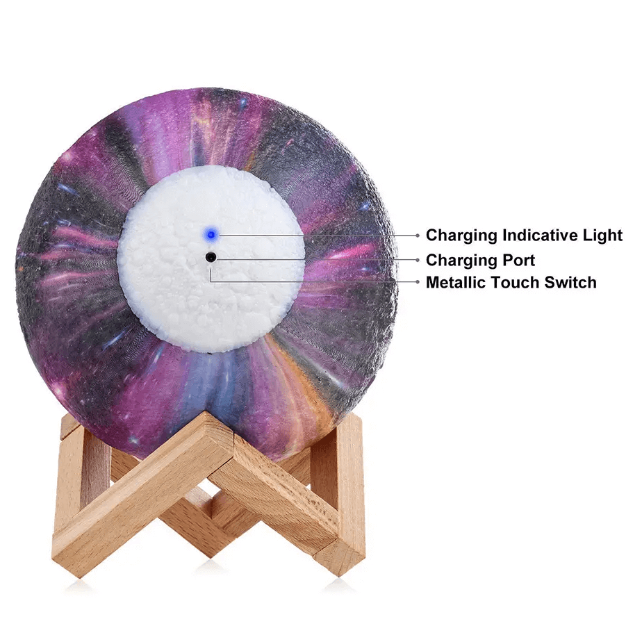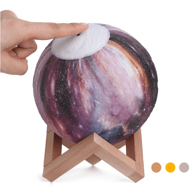 מנורת כדור בעיצוב גלקסיה נדלק בנגיעה, בגודל 14 ס"מ, הכוללת מעמד מעוצב מעץ, כולל סוללות נטענות על ידי חיבור USB, נדלק בקלות על ידי נגיעה באזור חיבור הכבל, 3 מצבי תאורה ,בהיר,חם,בהיר+חם