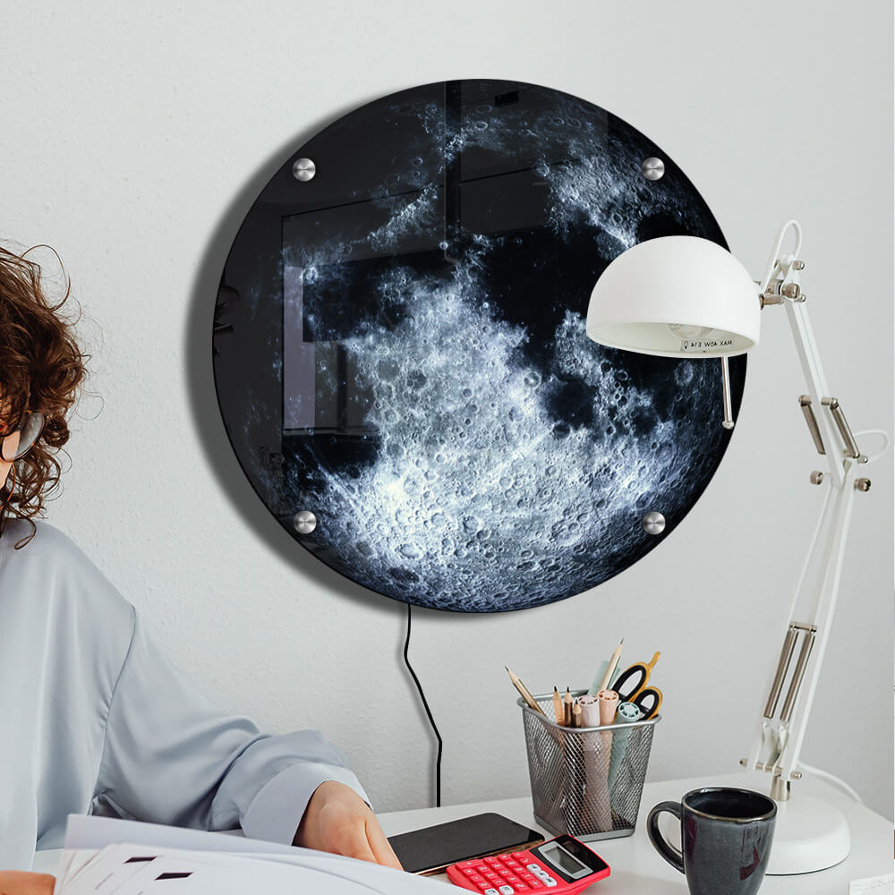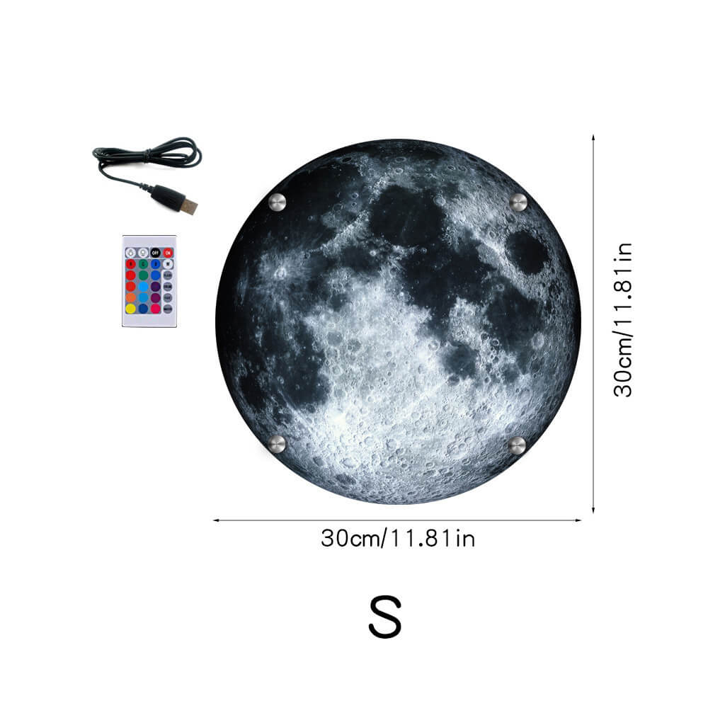 מנורת לילה בעיצוב ירח מחליף צבעים לתליה על קיר, מתנה לחדרי ילדים או אפילו לסלון, מנורה הניתנת לתליה על הקיר, או להניח על השולחן, וליהנות מירח מאיר בעיצוב תלת ממדי, עשוי מחומר אקריליק שמזכיר זכוכית במראה ובברק, גם שלא מדליקים את המנורה, אפשר ליהנות מהעיצוב היפה היוקרתי של המנורה ממש כמו תמונה של ירח .