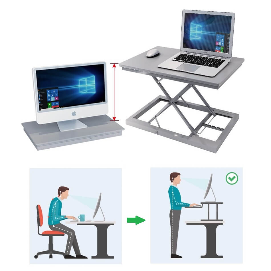 עמדת עבודה מתכוננת למצב ישיבה או עמידה לשולחן המחשב, הימים המודרנים של ישיבה ארוכה וממוכת על המחשב או אפילו ישיבה מול שולחן וכתיבה גורמים לכאבי גב ובעיות אורטופדיות, הגוף שלנו פשוט לא בנוי לישיבה כל כך ממושכת מול מסכים, לכן עמדת העבודה שלנו תפורה עבורכם, המוצר פשוט להפעלה , פשוט להניחה על השולחן הרגיל שלכם, ולבחור גובה רצויה, השולחן חזק במיוחד ומסוגל לשאת משקל של עד 18 קילו, אז קדימה הפתיעו את העובדים שלכם במתנה למשרד, או פשוט תפנקו את העצמכם במתנה לחג.