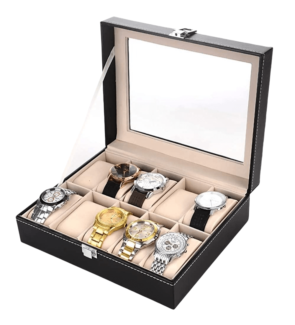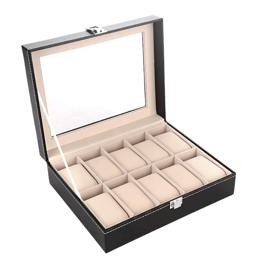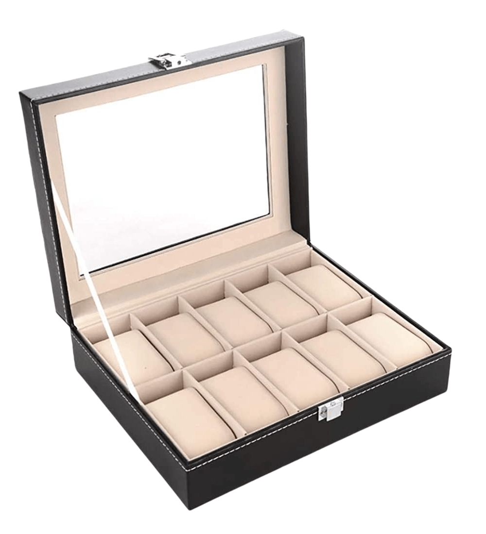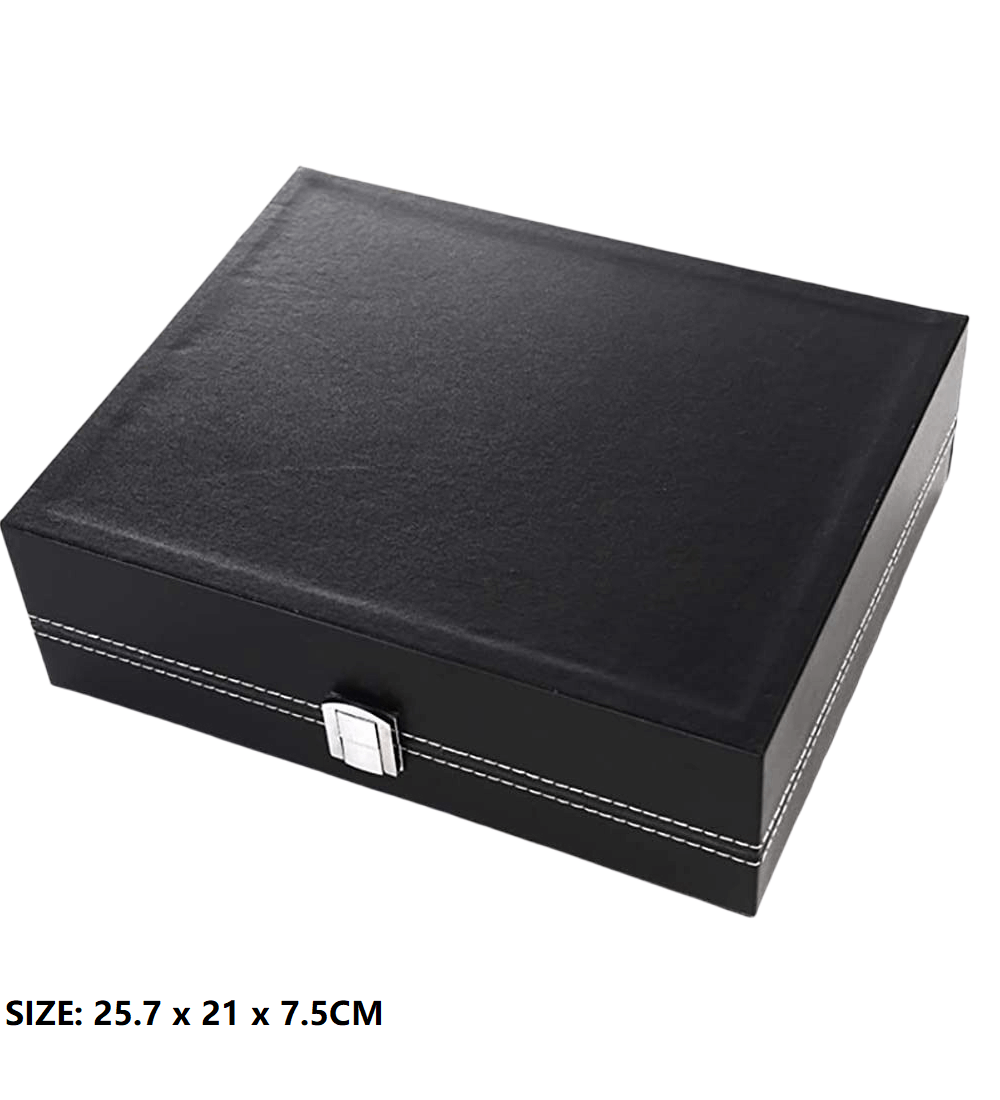 קופסת שעונים מהודרת, אשר מאפשר אכסון ושמירה של עד 10 שעוני גבר, או שעון אשה. מגן מפני לחות ואבק, וכולל חלון ראווה, הקופסה מצופה בחומר דמוי עור, ומאפשר סגירה הרמטית של הקופסה,מתנה מעולה לגברים או נשים, חובבי שעונים חייבים את זה.