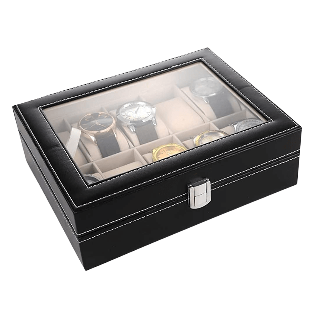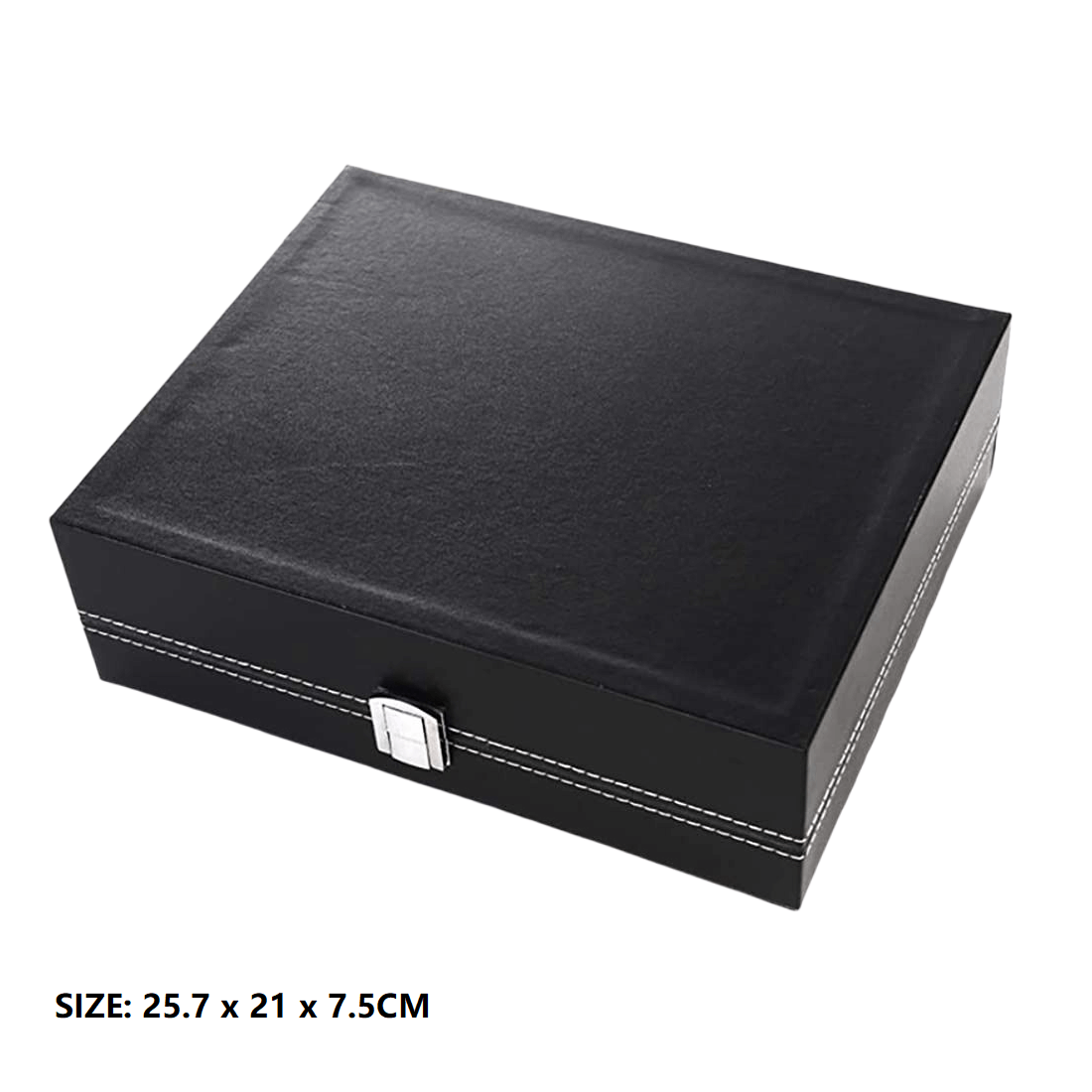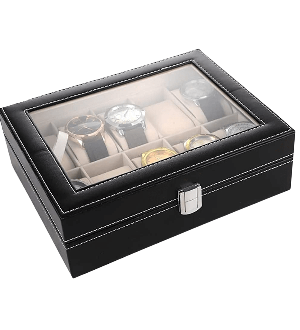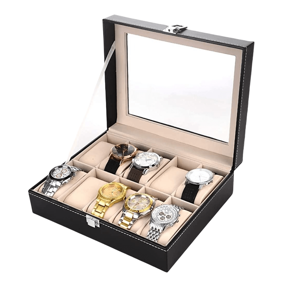 קופסת שעונים מהודרת, אשר מאפשר אכסון ושמירה של עד 10 שעוני גבר, או שעון אשה. מגן מפני לחות ואבק, וכולל חלון ראווה, הקופסה מצופה בחומר דמוי עור, ומאפשר סגירה הרמטית של הקופסה,מתנה מעולה לגברים או נשים, חובבי שעונים חייבים את זה.