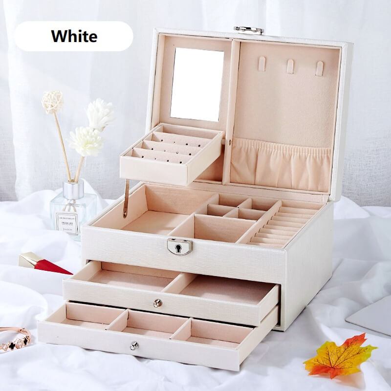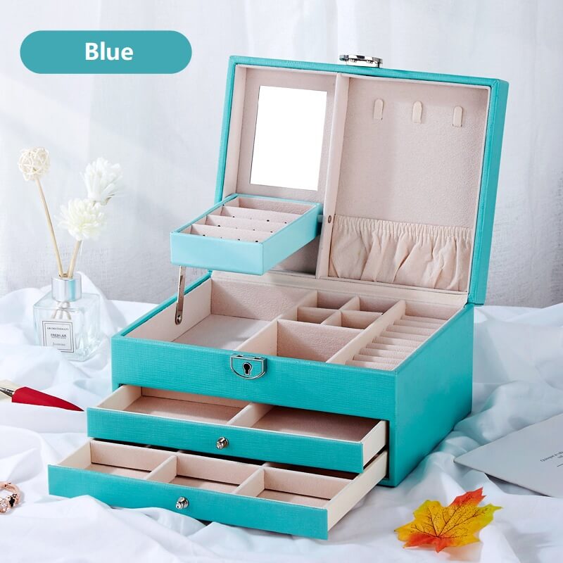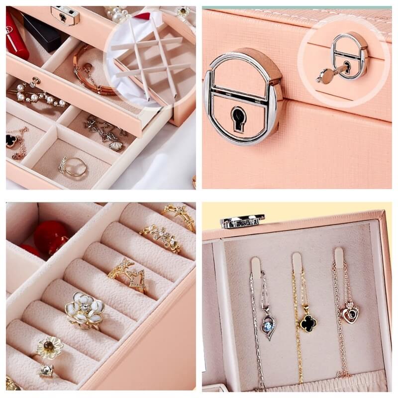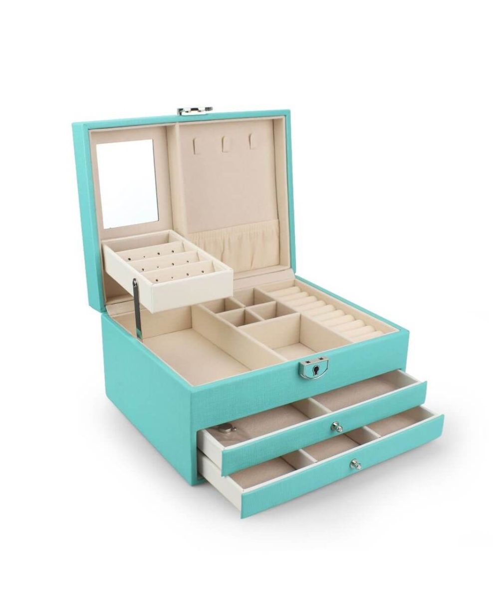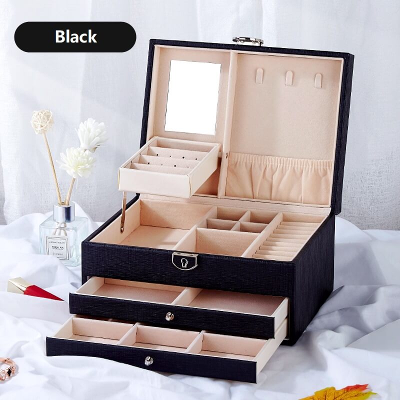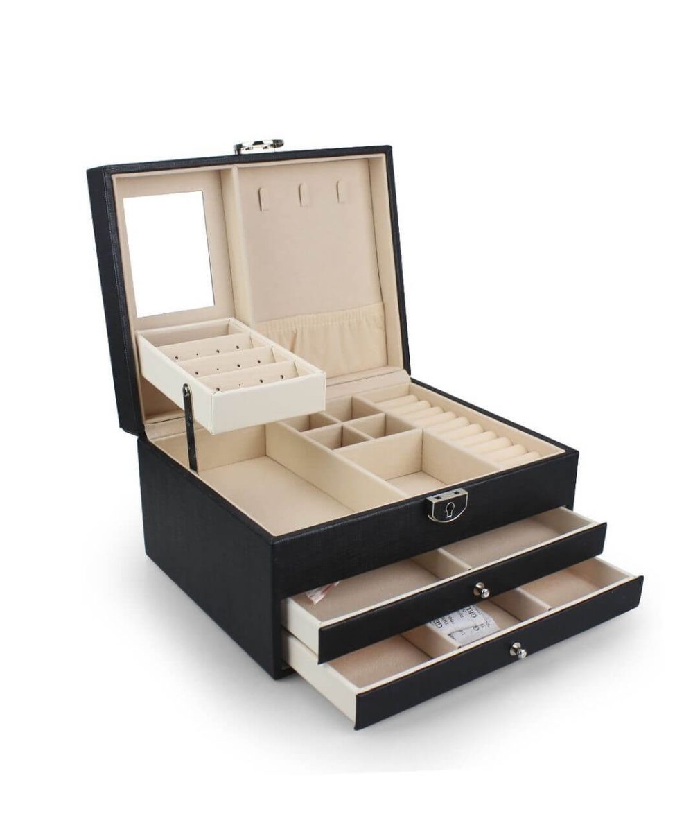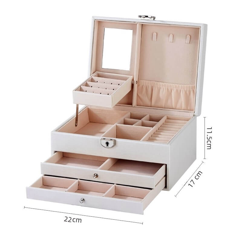 קופסת תכשיטים ענקית עם מקום לטבעות ושרשראות, מתנה מעולה לחובבי תכשיטים, וכמובן לאוהבים, תיבת תכשיטים במידה XL , פונקציונלית וקלה לשימוש, מצוינת לטיולים, כדי שתיקחו את כל התכשיטים אתכם, בנוסף תוכלו ליהנות ממראת איפור מובנת וקומפקטית אשר מובנת בתוך הקופסה, התיבה מכוסה דמוי עור איכותי דוחה מים וקל לניקוי.