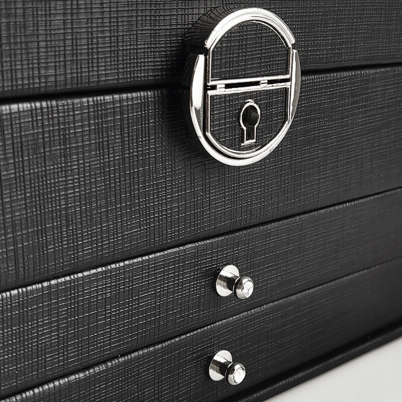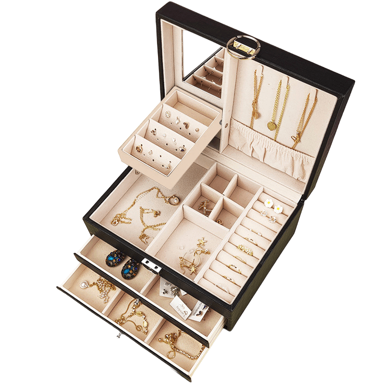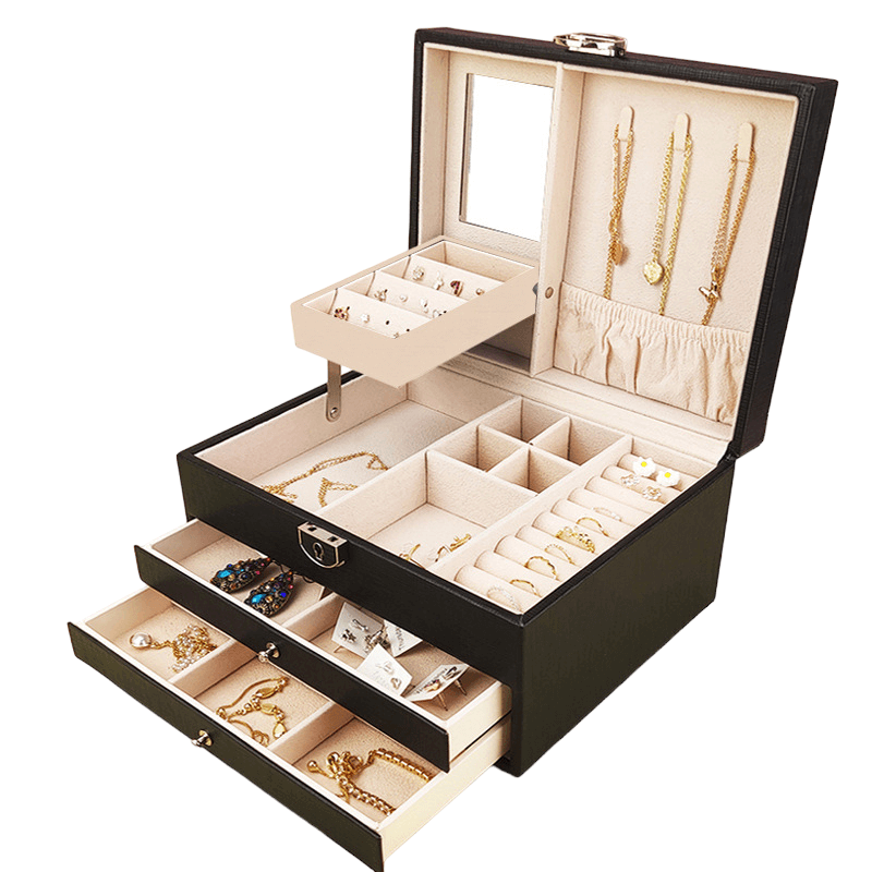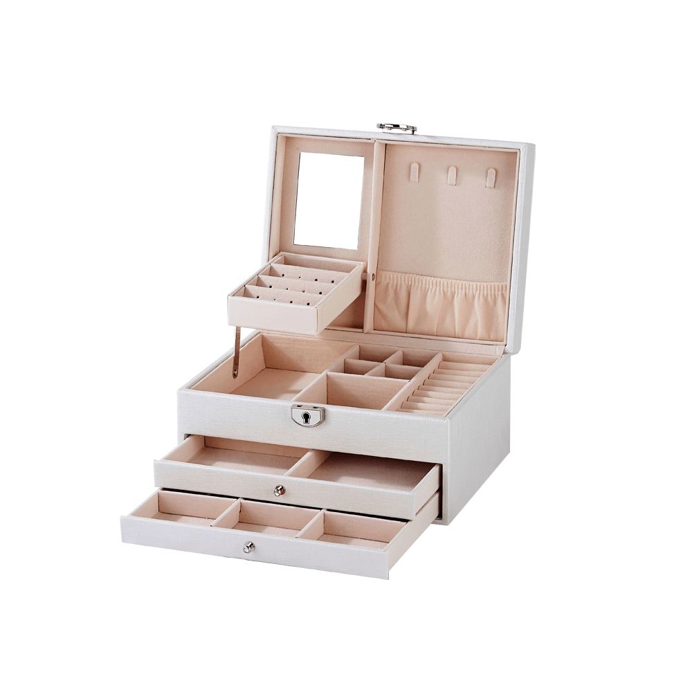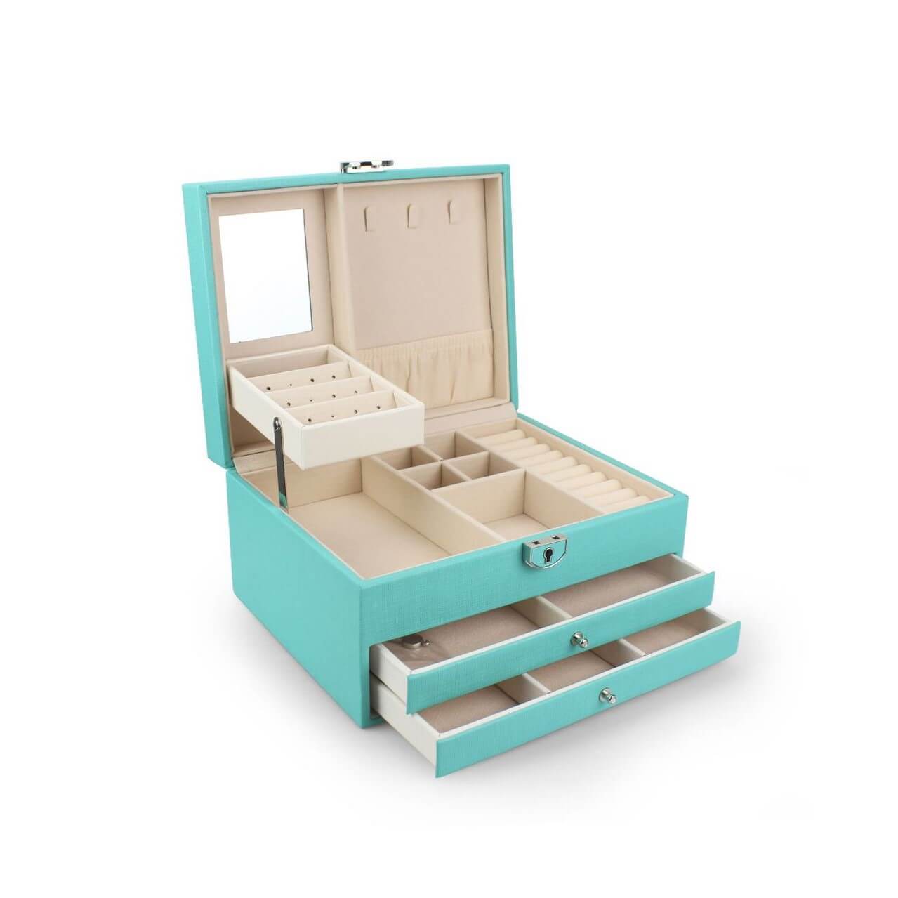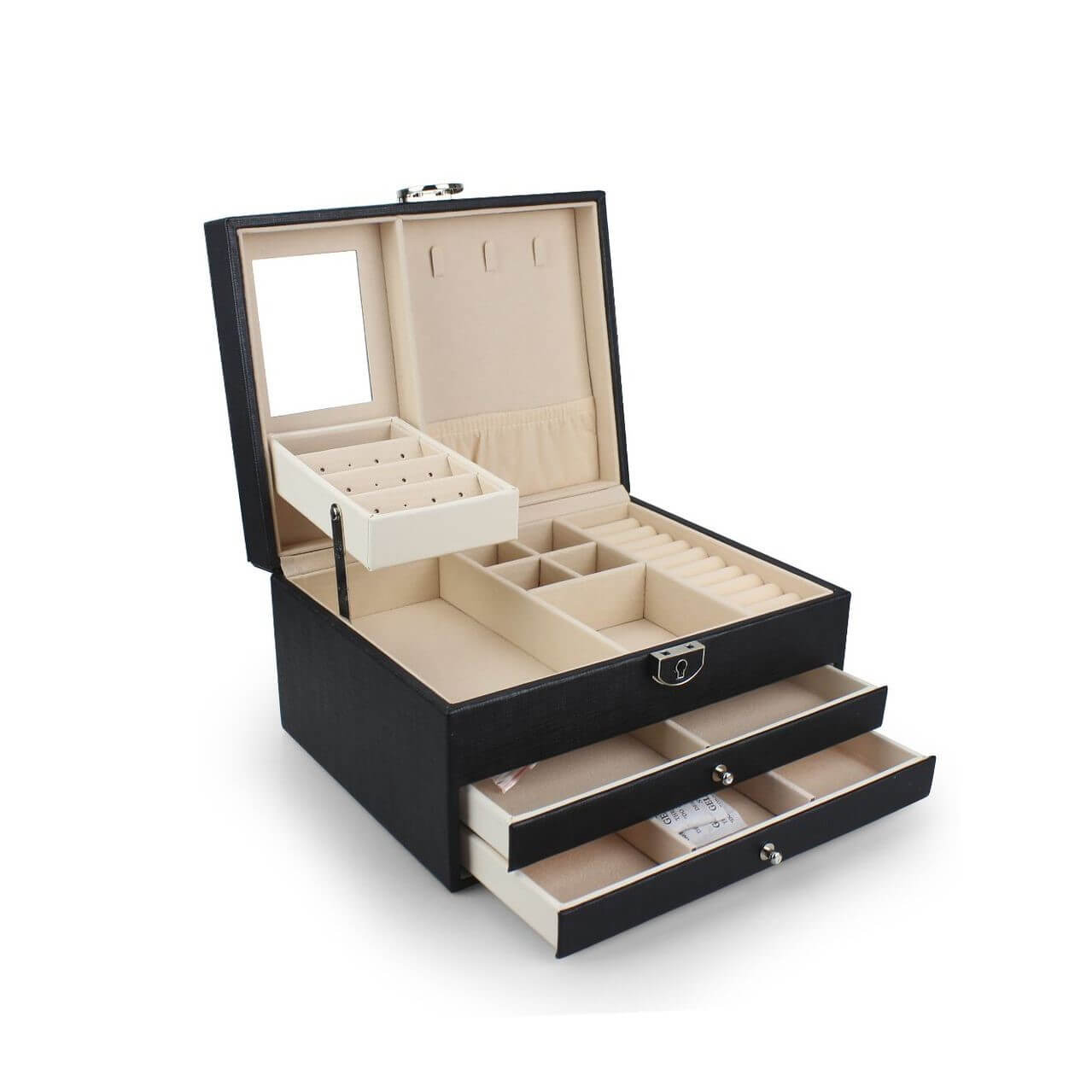 קופסת תכשיטים ענקית עם מקום לטבעות ושרשראות, מתנה מעולה לחובבי תכשיטים, וכמובן לאוהבים, תיבת תכשיטים במידה XL , פונקציונלית וקלה לשימוש, מצוינת לטיולים, כדי שתיקחו את כל התכשיטים אתכם, בנוסף תוכלו ליהנות ממראת איפור מובנת וקומפקטית אשר מובנת בתוך הקופסה, התיבה מכוסה דמוי עור איכותי דוחה מים וקל לניקוי.