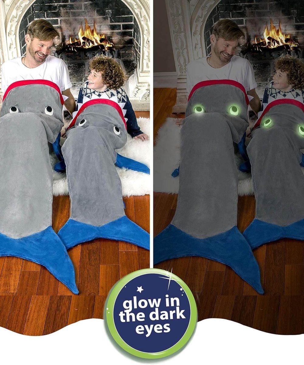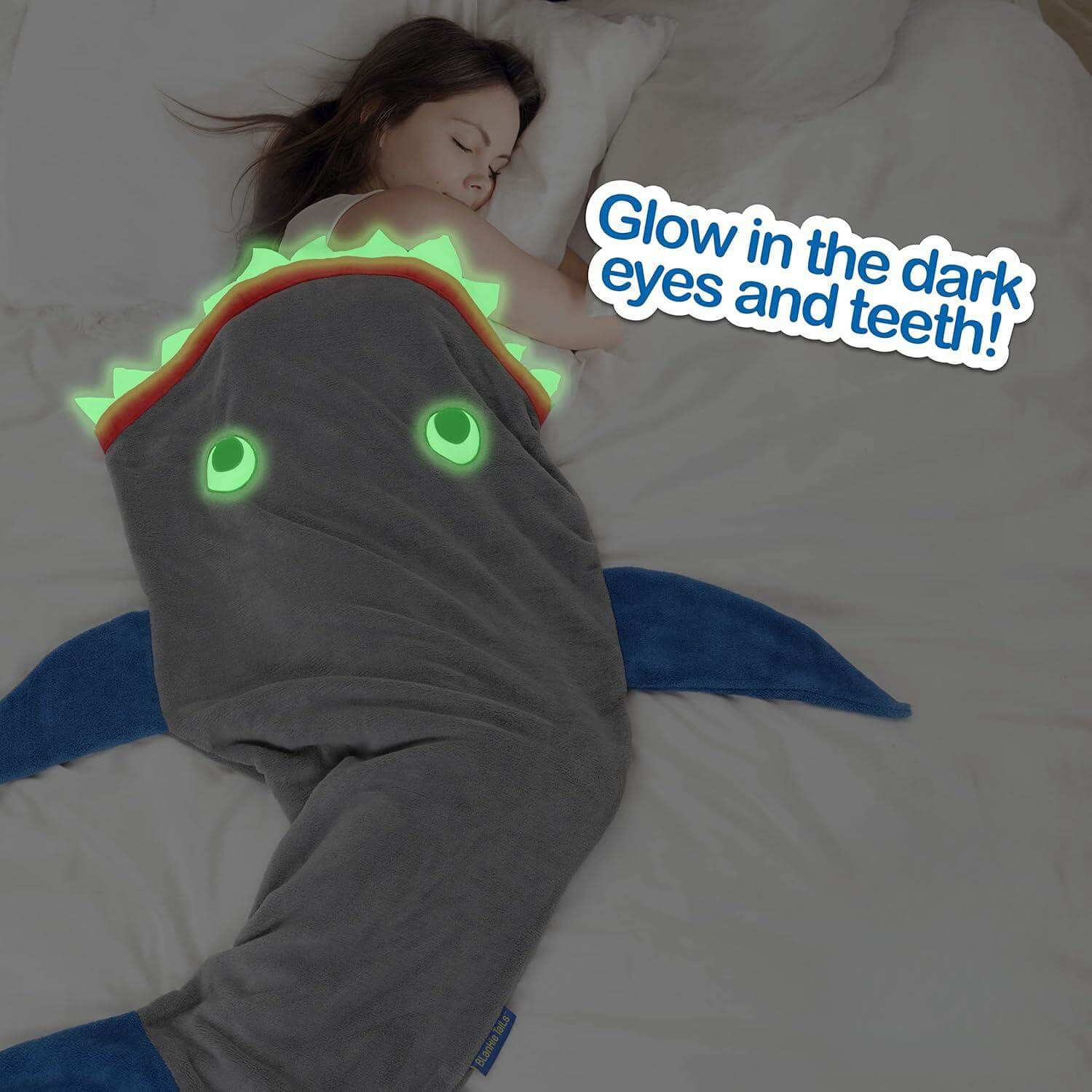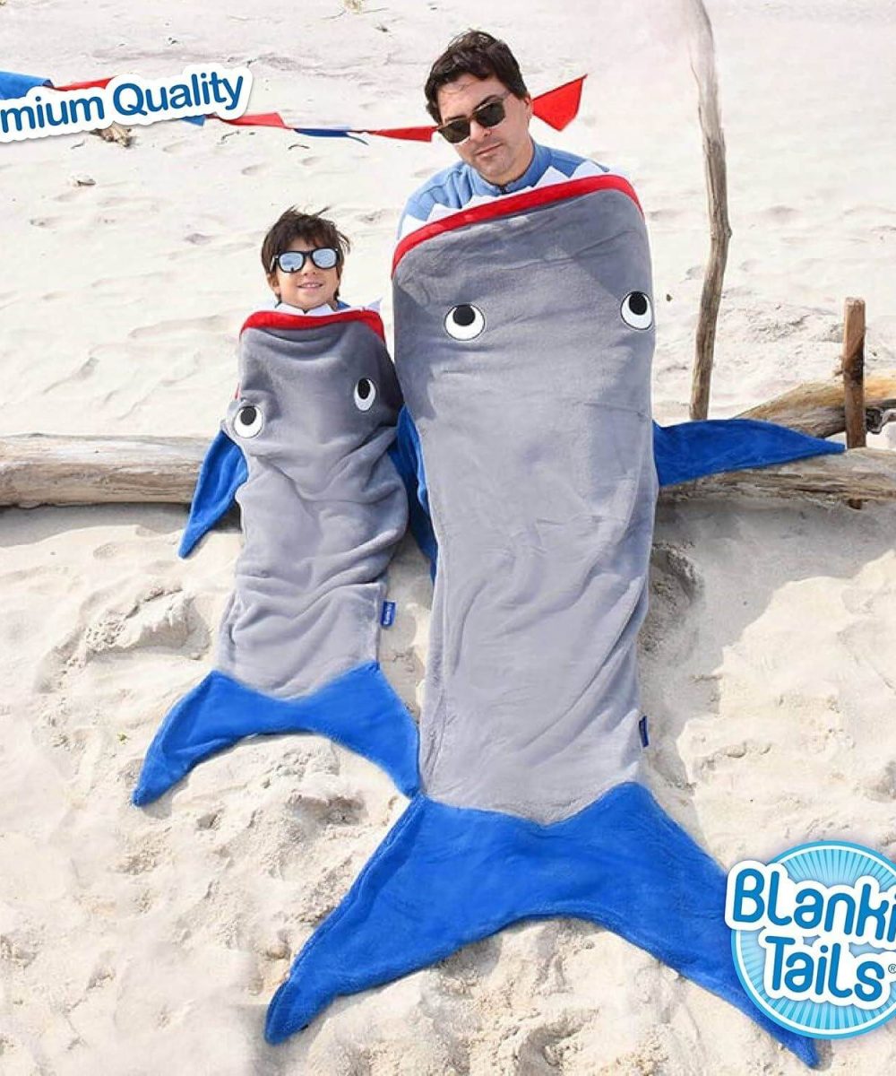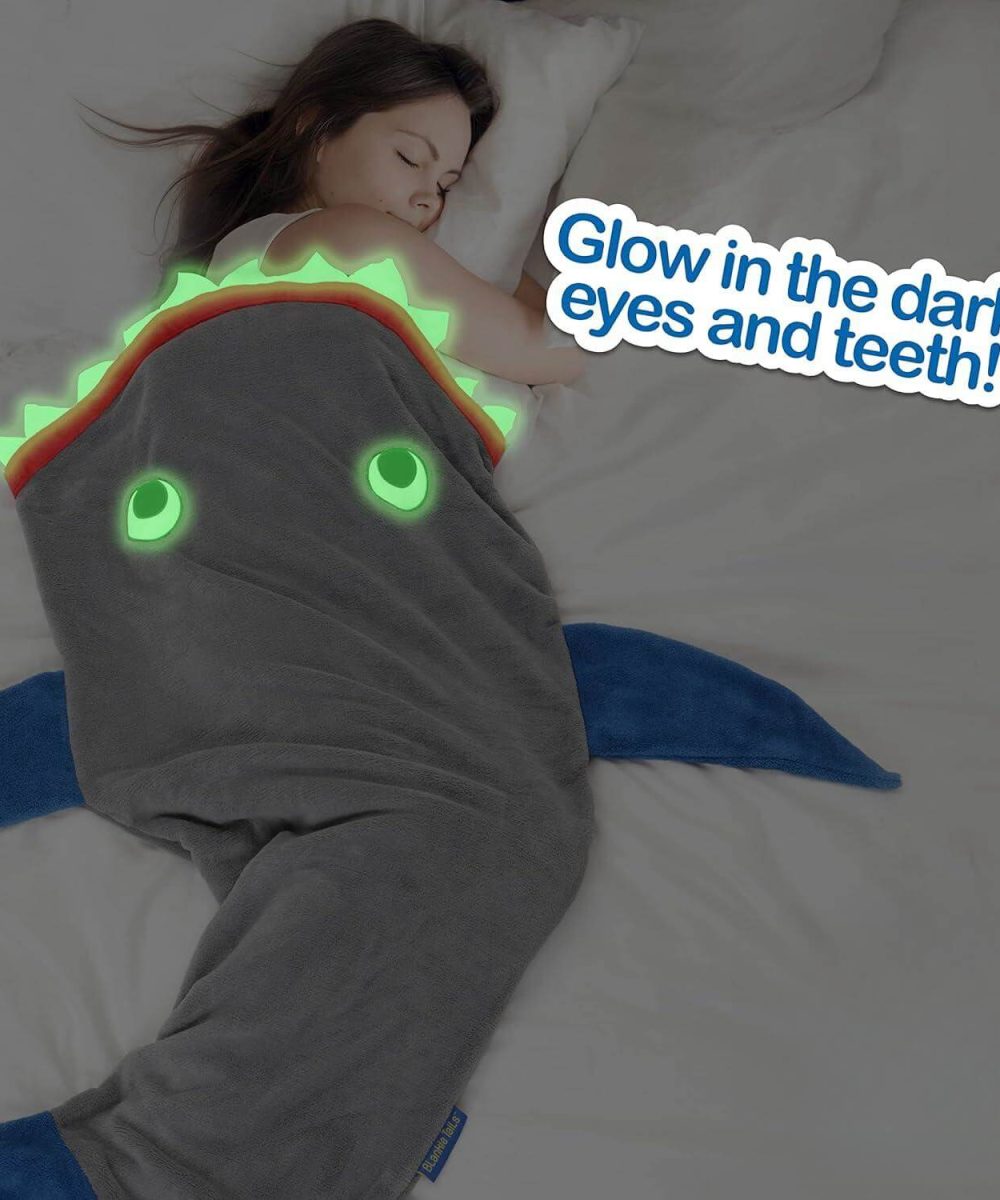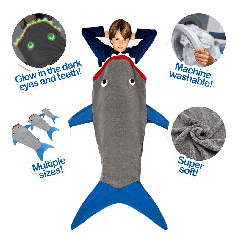 מחפשים דרך מקורית ומהנה להתחמם בחורף? שמיכת זנב הכריש הלבישה של Blankie Tails היא הפתרון המושלם! זוהי שמיכה נעימה במיוחד, דו צדדית, עשויה מפליז מינקי רך ונעים למגע, ועכשיו עם תוספת מדהימה – שיניים ועיניים זוהרות בחושך!