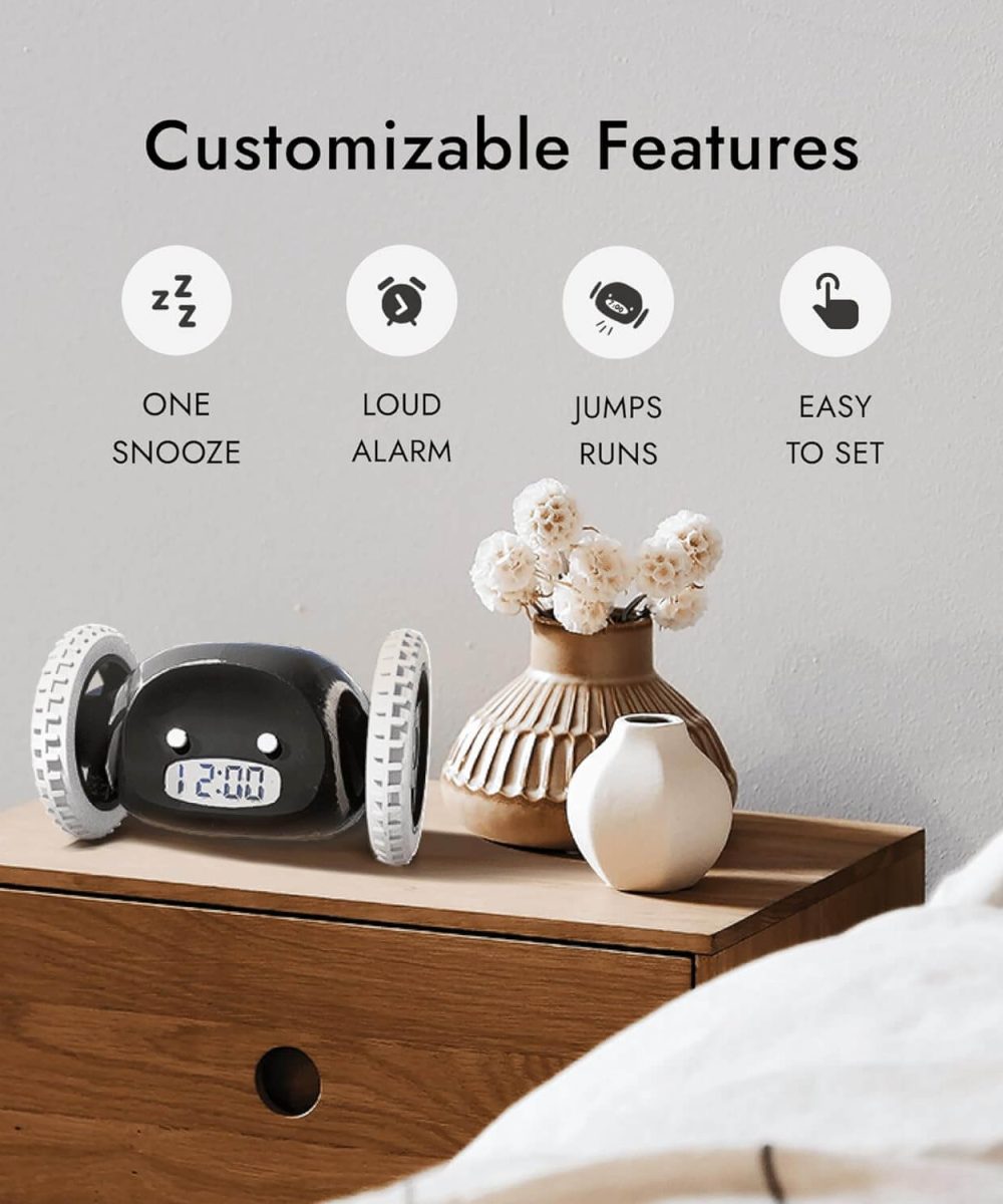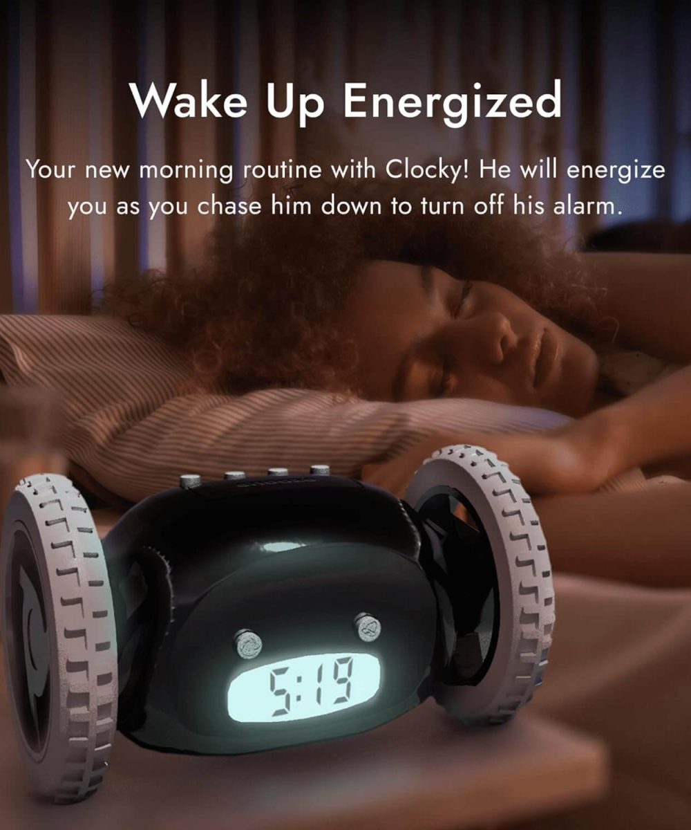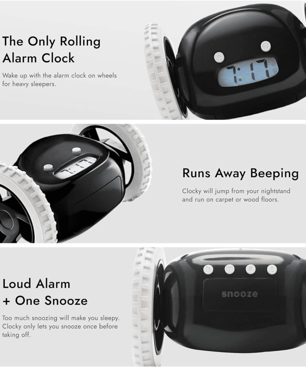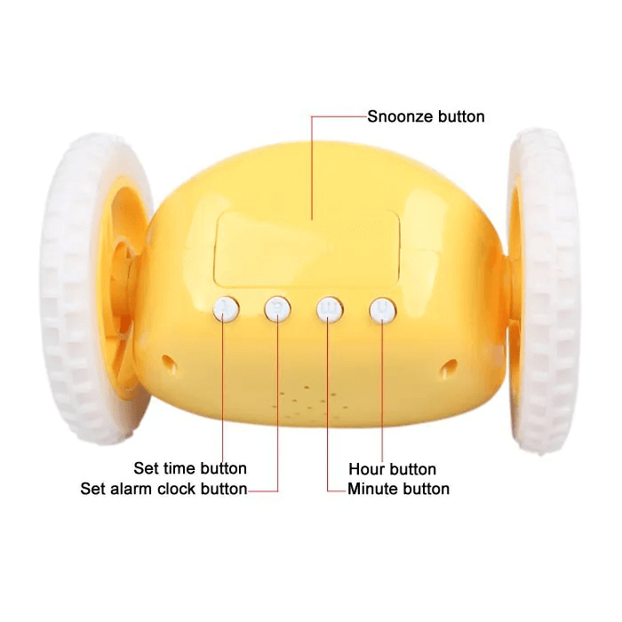 שעון מעורר על גלגלים למתקשים להתעורר, שעון מעורר נוסע טירוף מדליק כזה עוד לא ראיתם! שעון מעורר עם גלגלים, בזמן הצלצול השעון מתחיל לנסוע בחדר תוכך כדי השכמת כל החדר. שעון מדליק במיוחד, גאדג'ט מדליק לכל ילד או מבוגר, אי אפשר להתעלם מהשעון הזה.