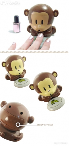 כמעט כל אישה מכירה את זה, צובעים את הציפורנים בלק, ועכשיו חייבים לחכות עד שזה יתייבש, מנופפים באצבעות, עושים פווווו בפה, ועוד שיטות שונות ומשונות. מכשיר מצחיק בצורת ראש קוף יעזור לך לייבש את הלק לאחר המריחה על הציפורניים, לוחצים קלות עם האצבע על המשטח העגול שלמרגלות המכשיר ורוח קלילה הנושבת מהפה של הקוף עוזרת ללק להתייבש בקלות יתר הרוח שיוצאת מהפה היא לא חזקה מדיי על מנת שלא לפגוע בלק, כך שזה פשוט אופטימלי ונוח ליבוש הלק ללא גרימת נזקים. תנסי ותתמכרי