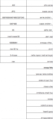 מיני DVR עם מצלמת כפתור איכותית ביותר, זמן סוללות ארוך במיוחד כ – 2 שעות צילום ברצף. אפשרות בחירה בצילום ווידיאו, צילום סטילס או הקלטת קול. מי צריך את זה? בימים אלו שהאלימות גוברת והולכת, כאשר אנו יותר ויותר מודאגים ומטרדים לגורל הרכוש שלנו, המשפחה שלנו או העסק שלנו, מגביר את הצורך של כל אחד להשתמש באמצעי תיעוד, על מנת להוכיח את צדקתו. מכשיר זה מאפשר לנו מגוון שימושים בהתאם לצרכים המשתנים שלו, אפשרויות הסלקה שונות, זמן סוללה ארוך במיוחד והעיקר אפשרות צפייה בשטח. המכשיר קטן כ – 7.5X5.5X2 ס"מ עם מסך כמעט באותו גודל. לא כולל כרטיס זיכרון MICRO SD
