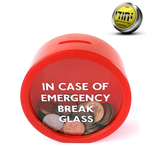 מתנה מדליקה! קופת חיסכון בצורת קופסת חירום. הקופסה שקופה בחזית כך שאפשר לראות את המטבעות. גאדג'ט יחודי ומדליק.