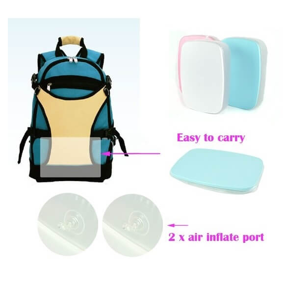 כרית מתנפחת רב שימושית למחשב לבית לרכב ולטבע כזה עוד לא ראיתם! כרית מתנפחת, צידה העליון של הכרית הוא מגש קשיח צבעוני וכל השאר מתנפח בהתאם לצורך! למה כרית זו יכולה לשמש? זו כרית רב שימושית ורב תכליתית: למחשב נייד כאשר אנחנו במיטה או בישיבה, מונע קרינה וחימום מיותר, ניתן לנפח בהתאם לצורך ולנוחות הדרושה. בטבע ניתן להשתמש בכרית ככרית לשינה או מנוחה נעימה, כמשענת לגב, כמגש למשקאות. בבריכה ניתן להשתמש בכרית כמגש משקאות צף. ברכב ניתן להשתמש כמשענת גב או כמעמד למחשב נייד לנוסעים ברכב. בבית או במשרד ניתן להשתמש ככרית רגילה, כמשענת לגב בכיסא ועוד ועוד.
